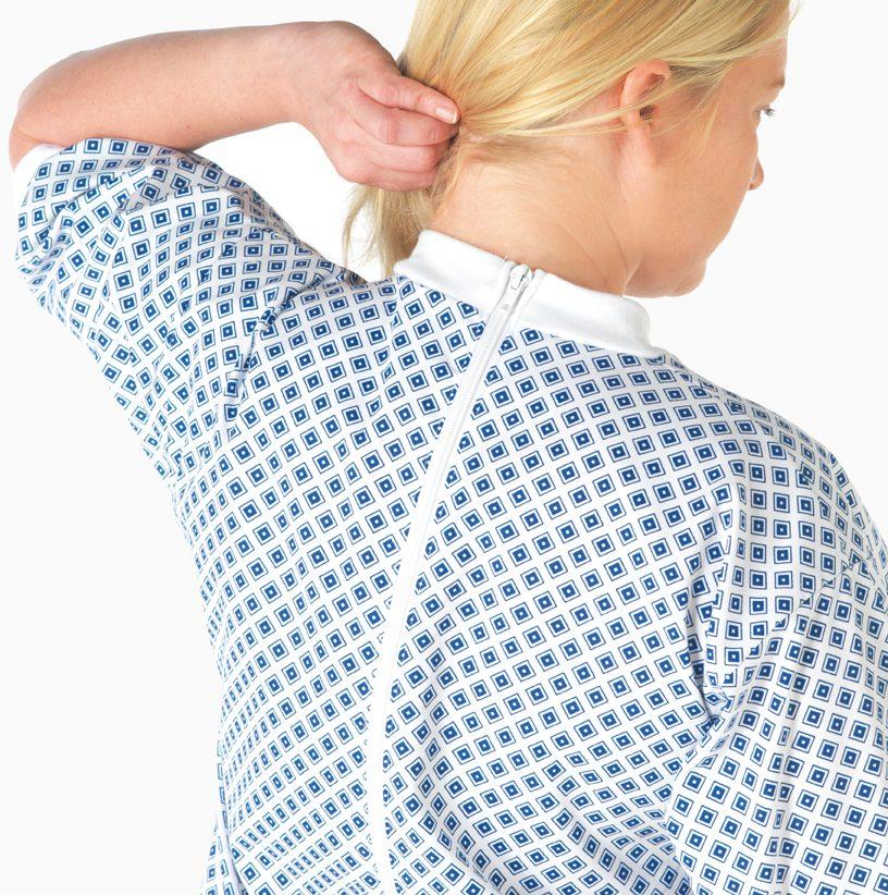 Fermeture par zip partant du nombril jusqu’en haut du dos.